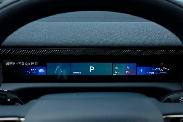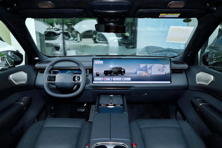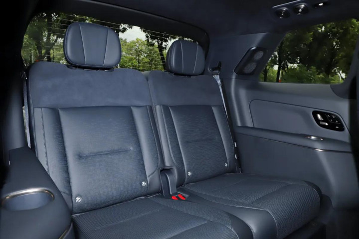 坐进车内,浓浓的科技感扑面而来。中控台上摆着12.66英寸行车电脑屏和30英寸的大中控屏,旁边就是空调出风口,这套空调系统配置贼全,后排独立空调、三区空调、车载空气净化器、PM2.5过滤、负离子发生器、香氛装置还有车载冰箱全都有。12.66英寸行车电脑屏前面是两幅式真皮方向盘,能上下前后电动调节,还有多功能控制、记忆和加热功能,握着手感特别好。方向盘前面的座椅是Nappa真皮缝接设计,零重力座椅坐着超舒服,主副驾还有二、三排座椅都能电动调节。那个30英寸的大中控屏看着就特有科技感,6K分辨率显示效果超清晰,卫星导航、路况展示、道路救援、蓝牙电话这些基础功能都有,还支持Flyme Link、Carlink、HUAWEI HiCar和CarPlay多种手机互联,车联网、OTA升级、面部和声纹识别也全都安排上了,12.66英寸的彩色行车电脑屏显示效果也很在线。另外还配备分段式不可开启全景天窗、全景天幕遮阳帘、车顶行李架等等。说实话这内饰不管是用料、配置还是科技感都没得挑,在同级别里很出色!