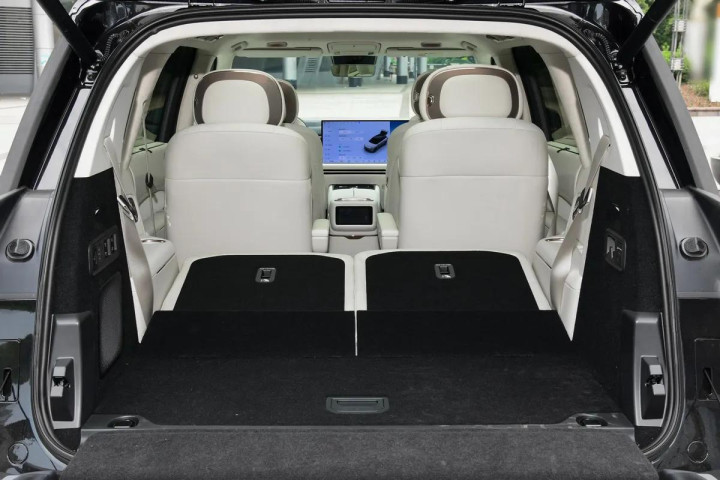 空间方面,这车的车身尺寸是5240x1999x1810mm,轴距直接干到3160mm,空间底子那是相当够用。我身高1米75,体型标准,坐进前排调好座椅和坐姿,头部能有16指左右的富余;前排位置不动,坐进第二排再调整一下,头部也还有12指的空间。更给力的是,第二排腿部留九指空间的时候,第三排腿部还有5指空间,头部也能有5指,完全不憋屈。打开感应式电动后尾门,后备厢容积能从281L扩展到1050L,长度460mm到1360mm可调,宽度1130mm、高度800mm,开口离地850mm,搬东西也方便。不管是坐人还是装东西,都能满足日常家用需求。